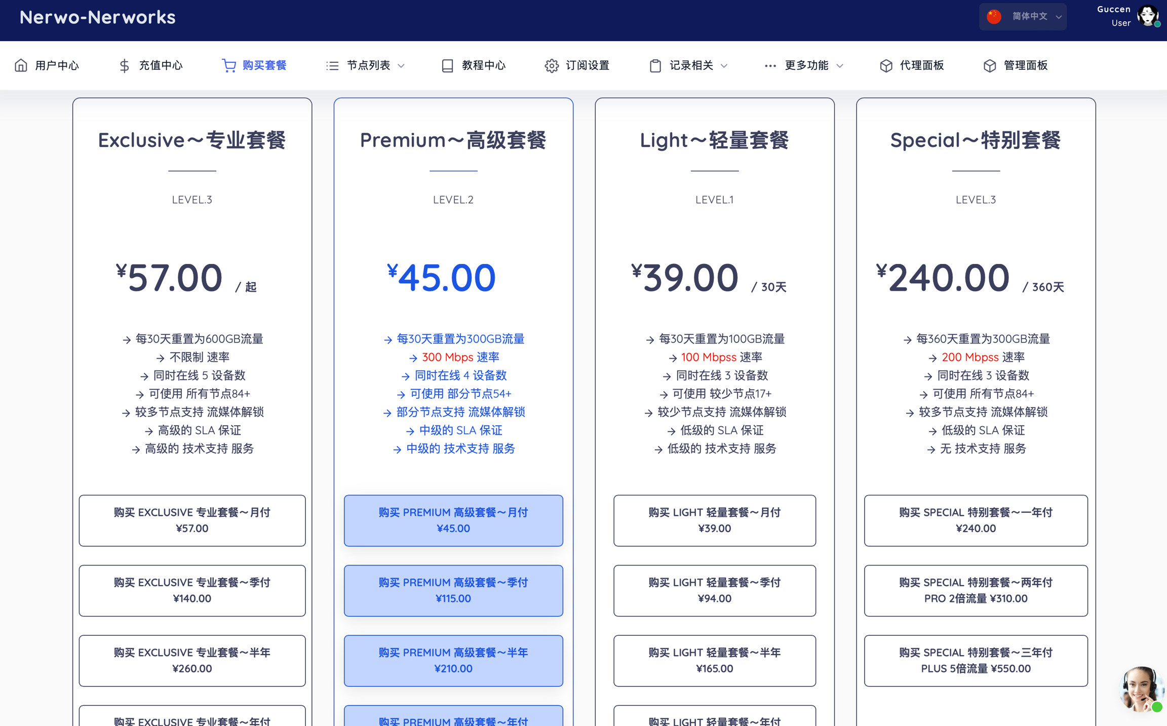 购买须知(重要): 若套餐到期,请直接再购买您需要的套餐即可 若在套餐未到期的情况下购买新套餐: 1、 当新旧套餐是同一系列时: 等级有效时长会自动叠加,流量会被重置。但流量重置日会变成每30天重置多次,即为您每次购买套餐的购买日,因此您不需要进行任何操作,这样的机制基本保证了双方没有损失 2、 当新旧套餐不属于同一系列时: 等级时间会被重置,流量也会被重置,解决办法请参考:3 3、补充:如需升级套餐(前后两次购买套餐不属于同一系列)请直接购买想要的套餐,然后建立工单我们会帮您将旧套餐的剩余价值折算到新套餐内(会有适当奖励); 4、当我们发布优惠时若在优惠前3天内购买过正价的套餐请发送工单至财务部门我们将支持退款差价至余额 5、为方便流量统计,一月是按照30天来计算的购买前请您务必首先查看我们的服务条约: https://nerwo.co/Terms 6、购买前请您务必首先查看我们的服务条约: https://nerwo.co/Terms