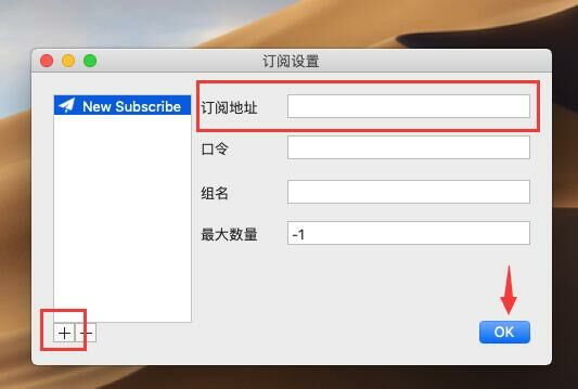 点击 “+” 订阅地址处复制粘贴订阅定制,然后ok