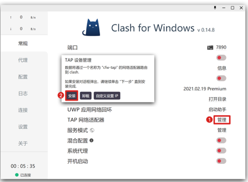 一般情况下不需要开启 Tap 模式用途 对于不遵循系统代理的软件,TAP 模式可以接管其流量并交由 CFW 处理。例如 Windows 远程桌面 RDP 、Xshell 或 Putty 等软件的 ssh 、亦或是其他不遵循系统 HTTP 代理的软件在开启 Tap 模式后都由 CFW 处理。 开启方法