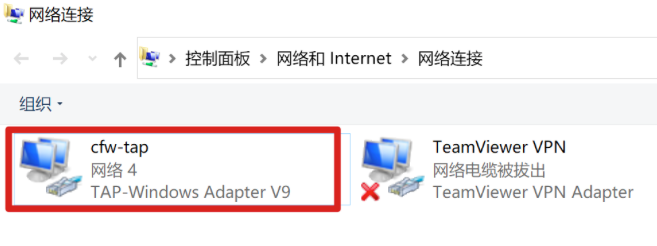 请确保启动代理后,网络适配器里的 cfw-tap 显示为启用状态,如图所示。 如果 cfw-tap 显示网络电缆被拔出,建议重启电脑。如果仍然,请重复上一步开启方法,进行卸载 -> 安装。