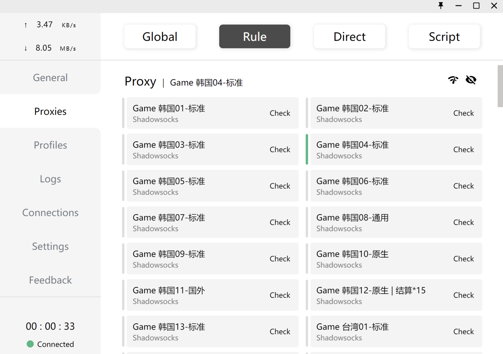 请注意,不要点击 Clash for Windows 软件的任何延迟测速。因为延迟测速会对每个节点进行连接并测试http 延迟。